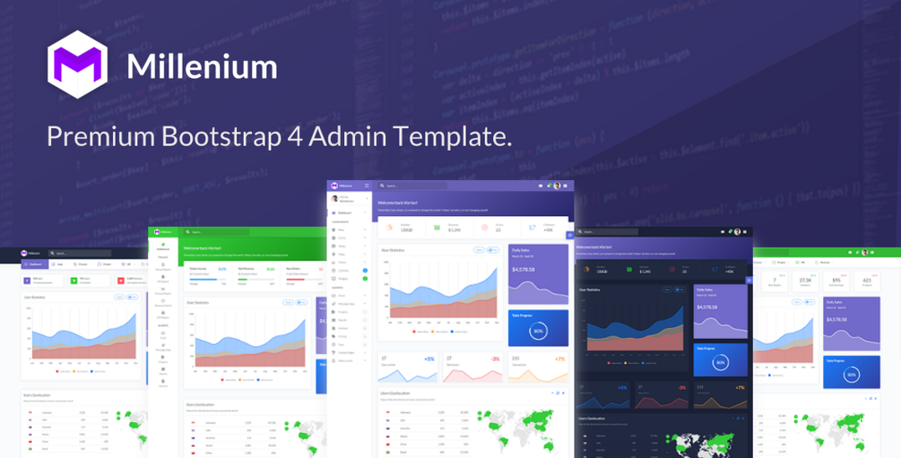 Millenium is a beautiful and elegant Bootstrap 4 admin dashboard designed to manage and visualize data about your business. It combines easy colors on the eyes, wide cards, beautiful typography, and graphics.